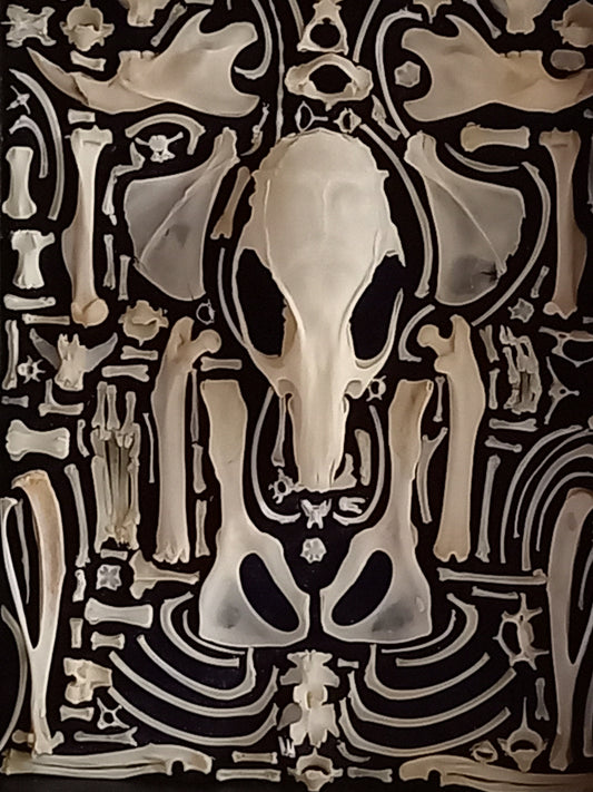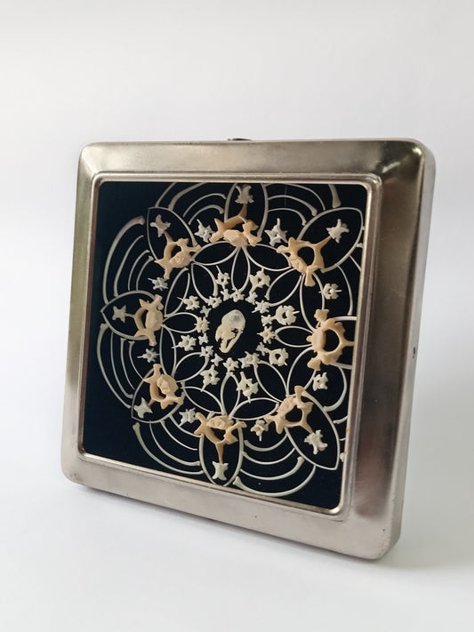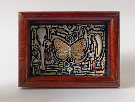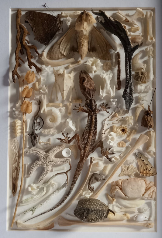 Our "Nature Compositions" are unique arrangement of natural elements—bones, shells, skulls, insects, and other found specimens—displayed under glass in artfully crafted box frames. The frames are sourced from thrift stores, some vintage, each with its own history that adds to the charm of the composition. These natural artifacts are meticulously laid out in fluid, mosaic-like patterns, where each element seamlessly flows into the next, creating a harmonious visual narrative. Every piece captures the natural beauty of the wild and the artistry of nature, celebrating the intricate balance of life and decay. This collection transforms found objects into mesmerizing works of art, offering a unique window into the organic beauty that surrounds us.