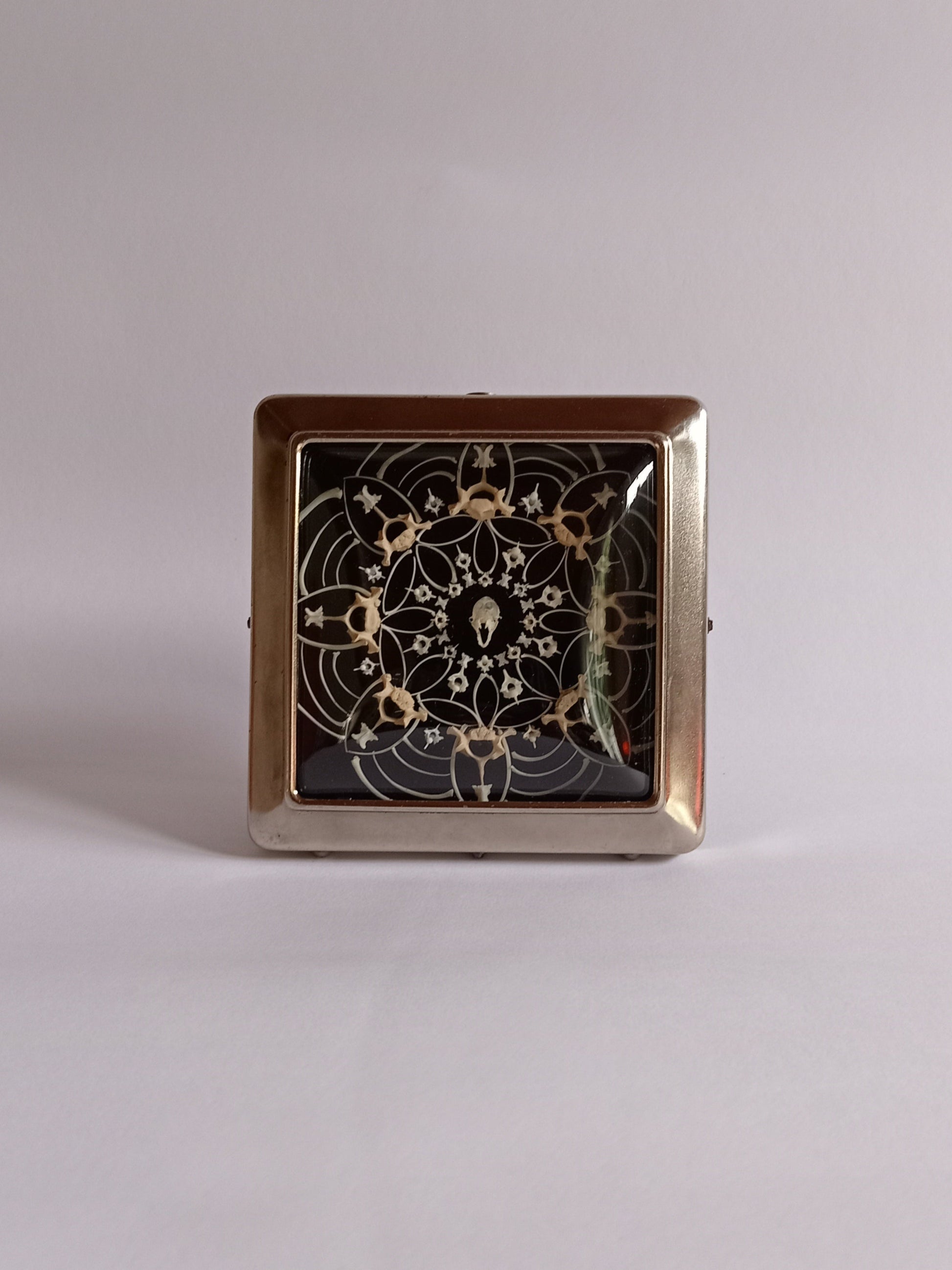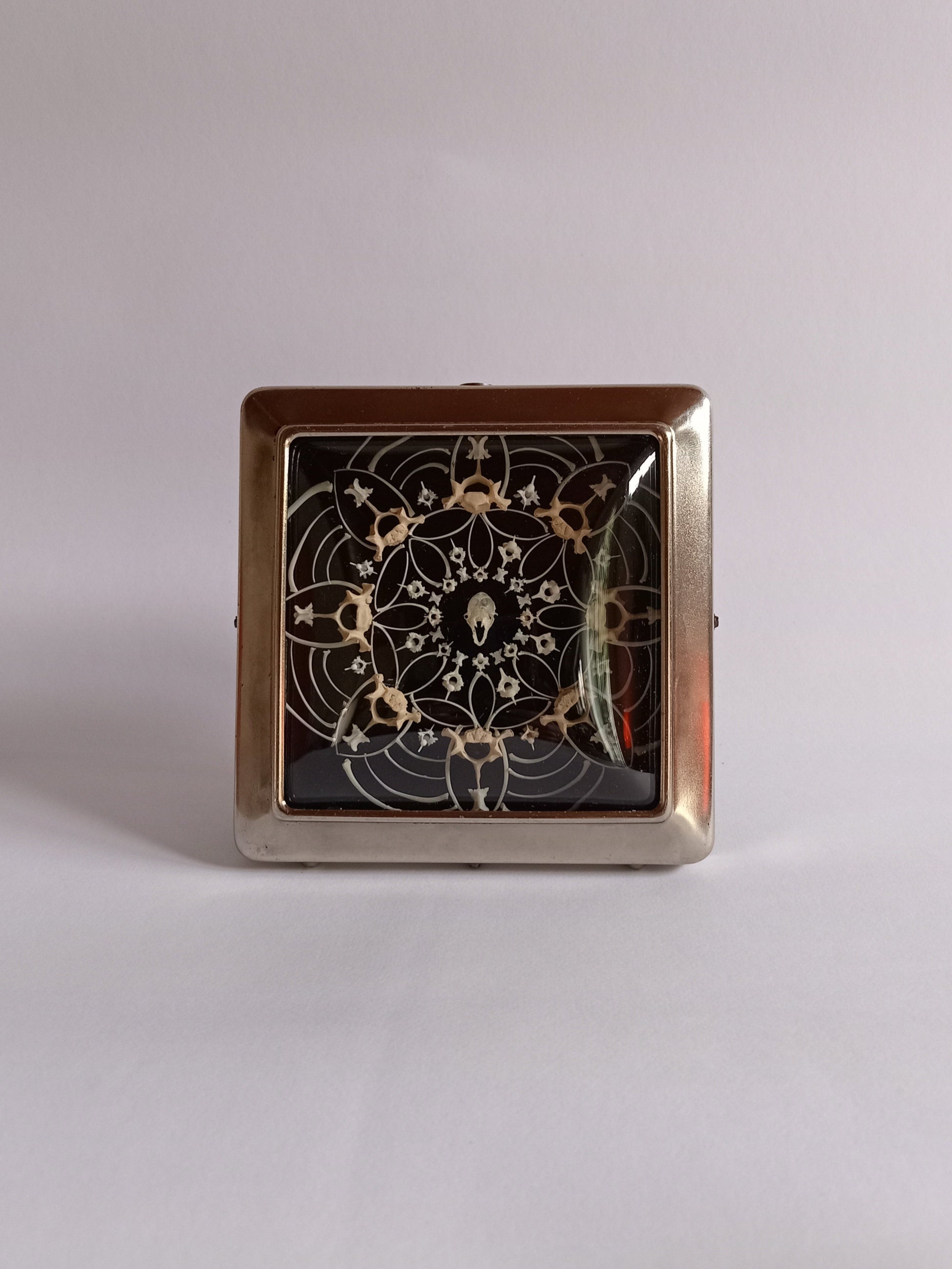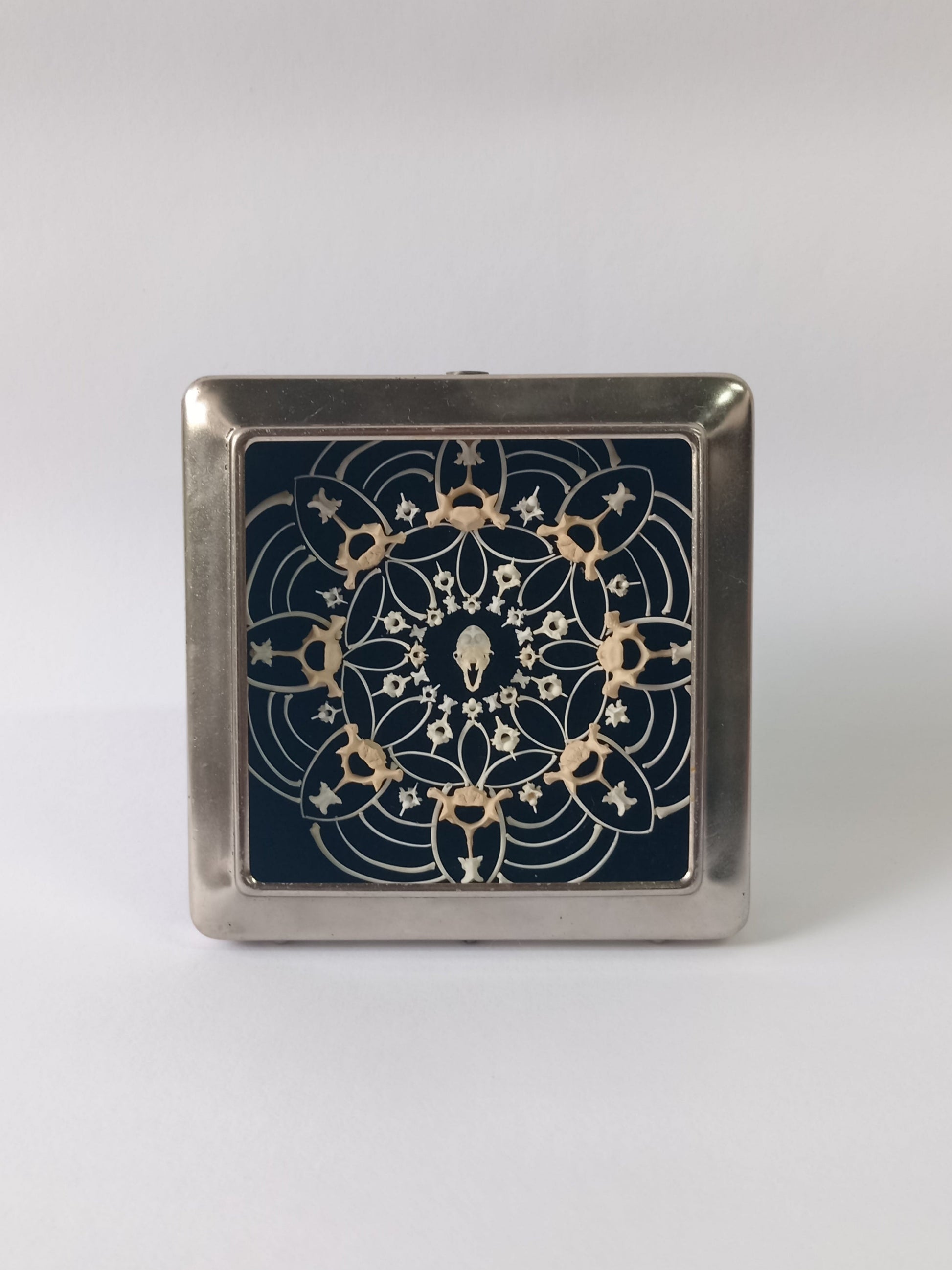 A bone mandala, carefully arranged into a harmonious design and set against black velvet within a vintage square clock casing. Each bone is placed with intention, creating a balance of symmetry and organic form — a unique fusion of nature’s relics and timeless craftsmanship.