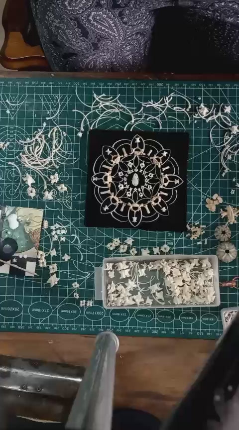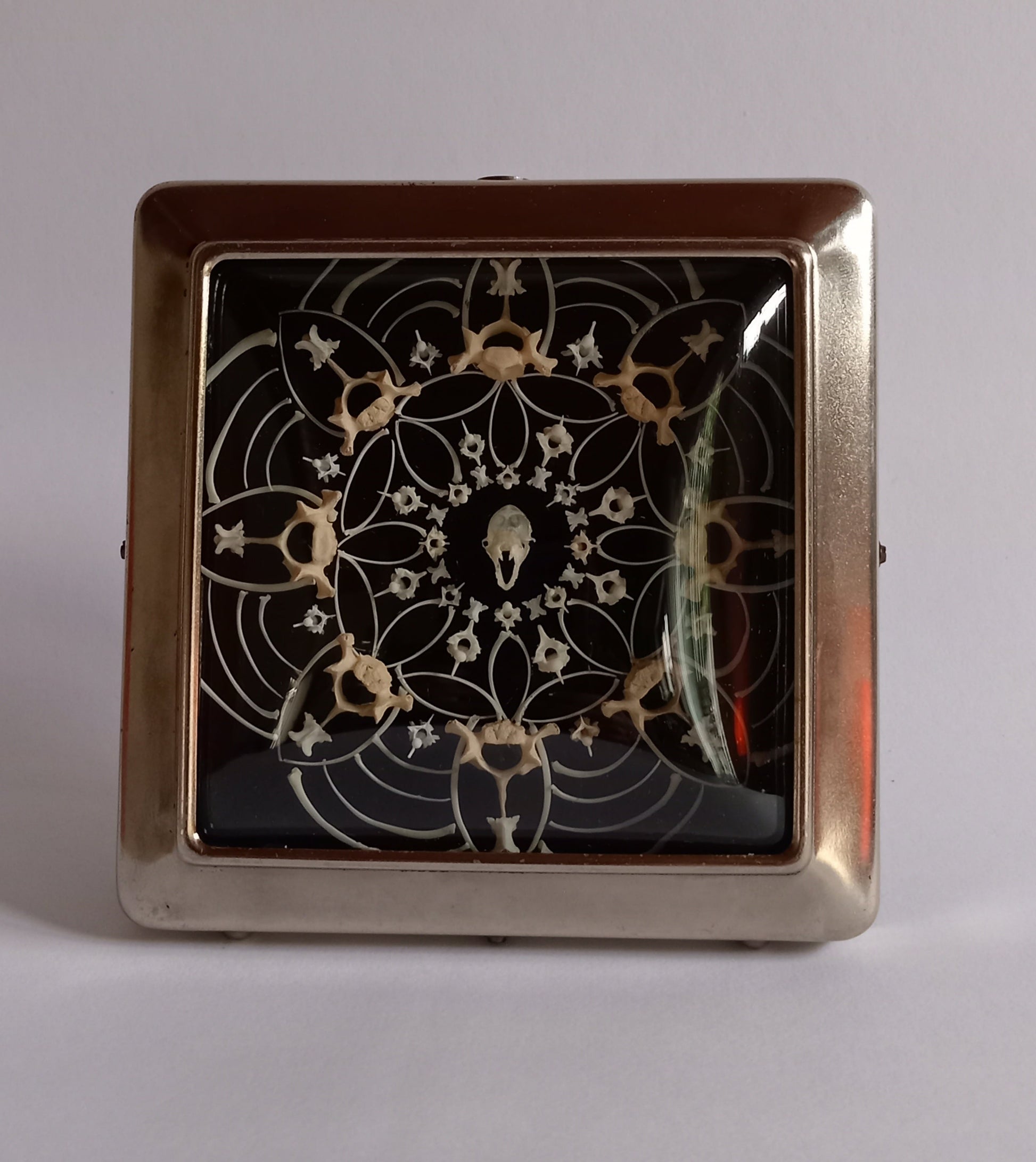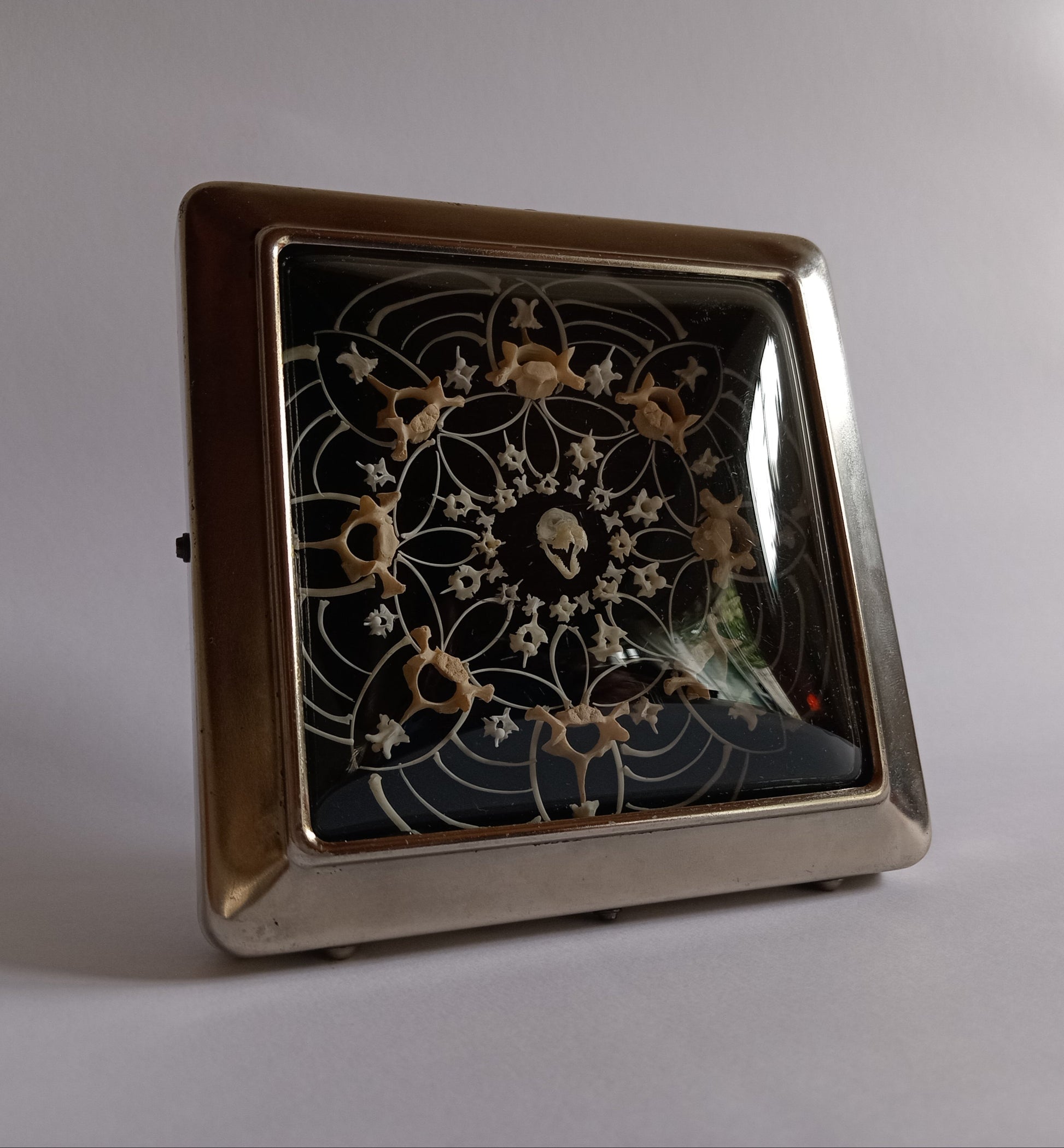 A bone mandala, carefully arranged into a harmonious design and set against black velvet within a vintage square clock casing. Each bone is placed with intention, creating a balance of symmetry and organic form — a unique fusion of nature’s relics and timeless craftsmanship.