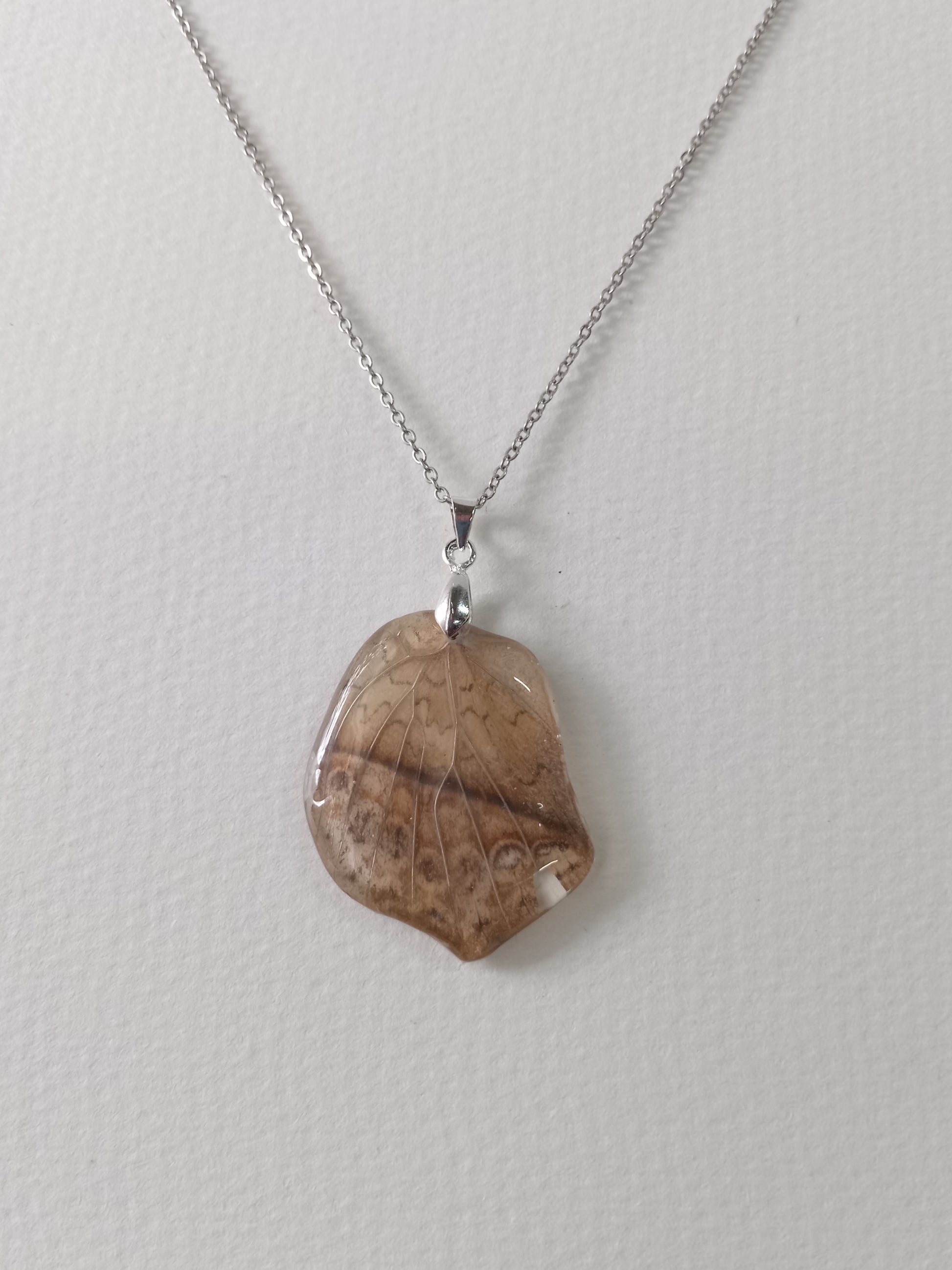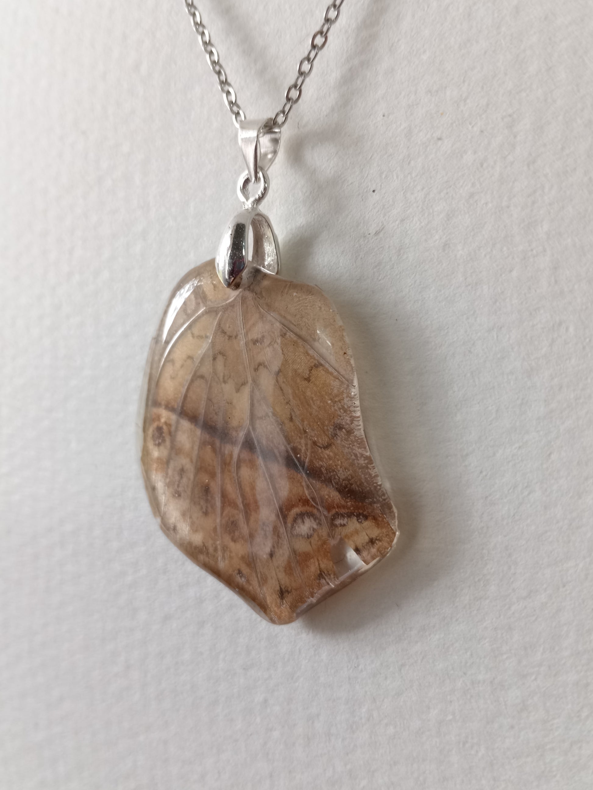 A real butterfly wing, delicately preserved in clear resin. The natural colors and patterns are showcased in detail, transforming a fragile moment of nature into a lasting piece of wearable art.