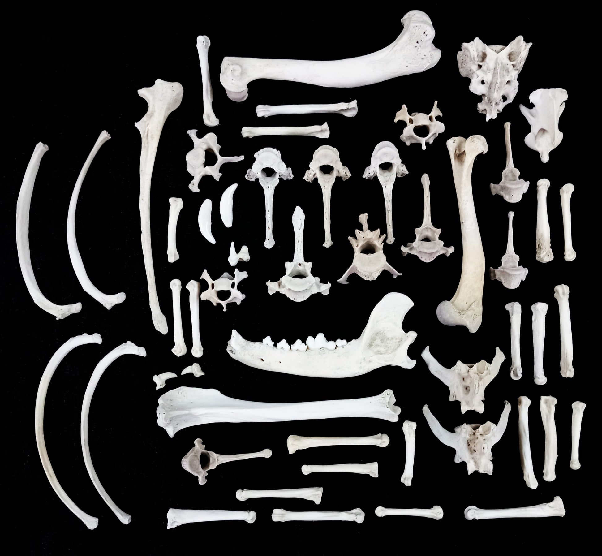 A collection of ethically sourced canine bones, weathered by nature, hand cleaned and sterilized. Each bone is unique, showing natural variation in texture and coloration from the elements.