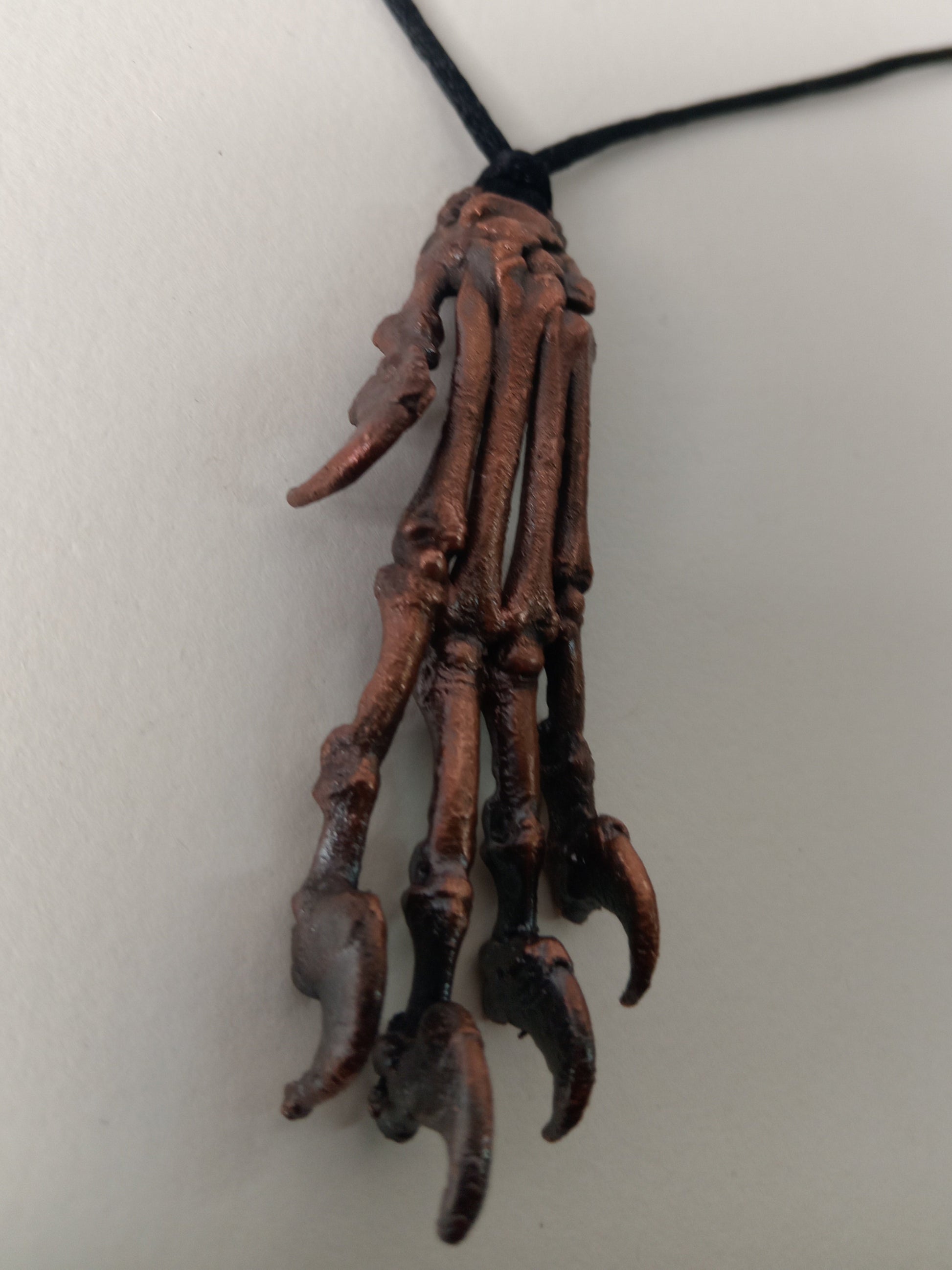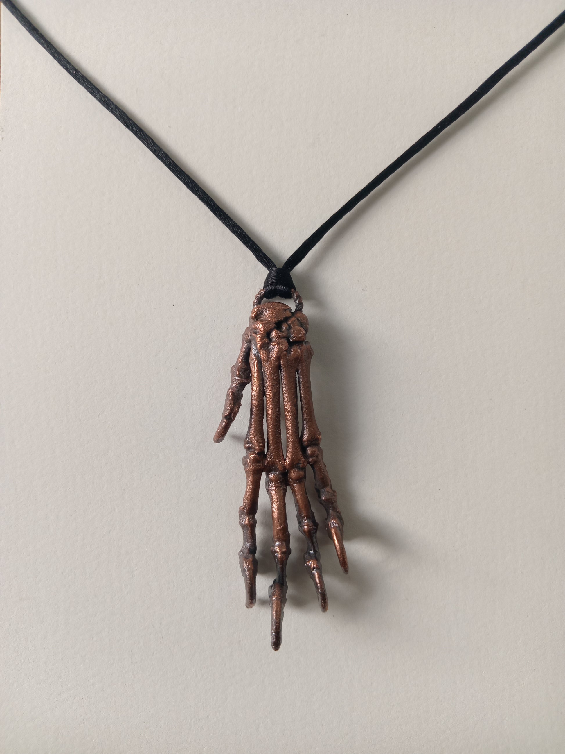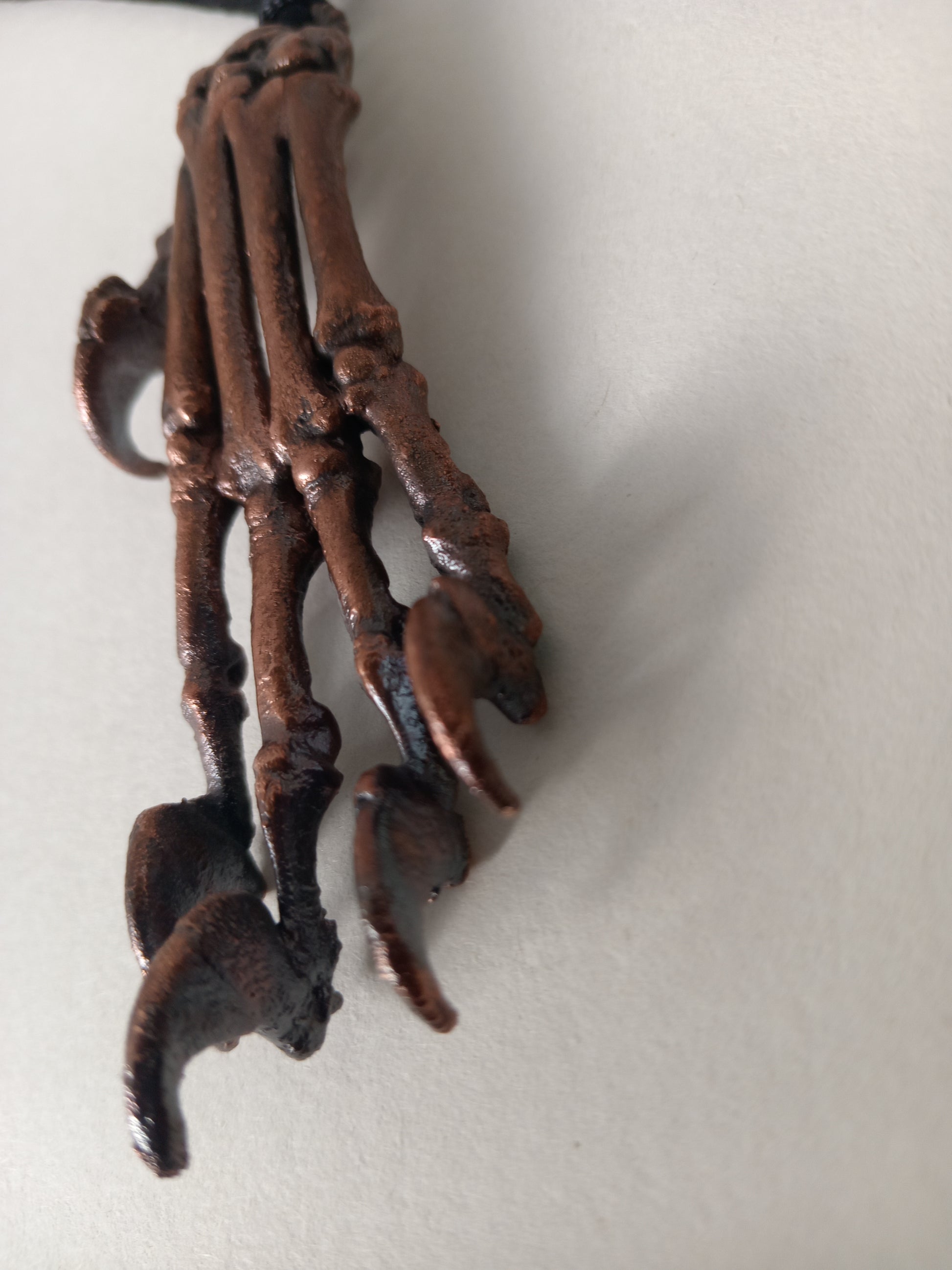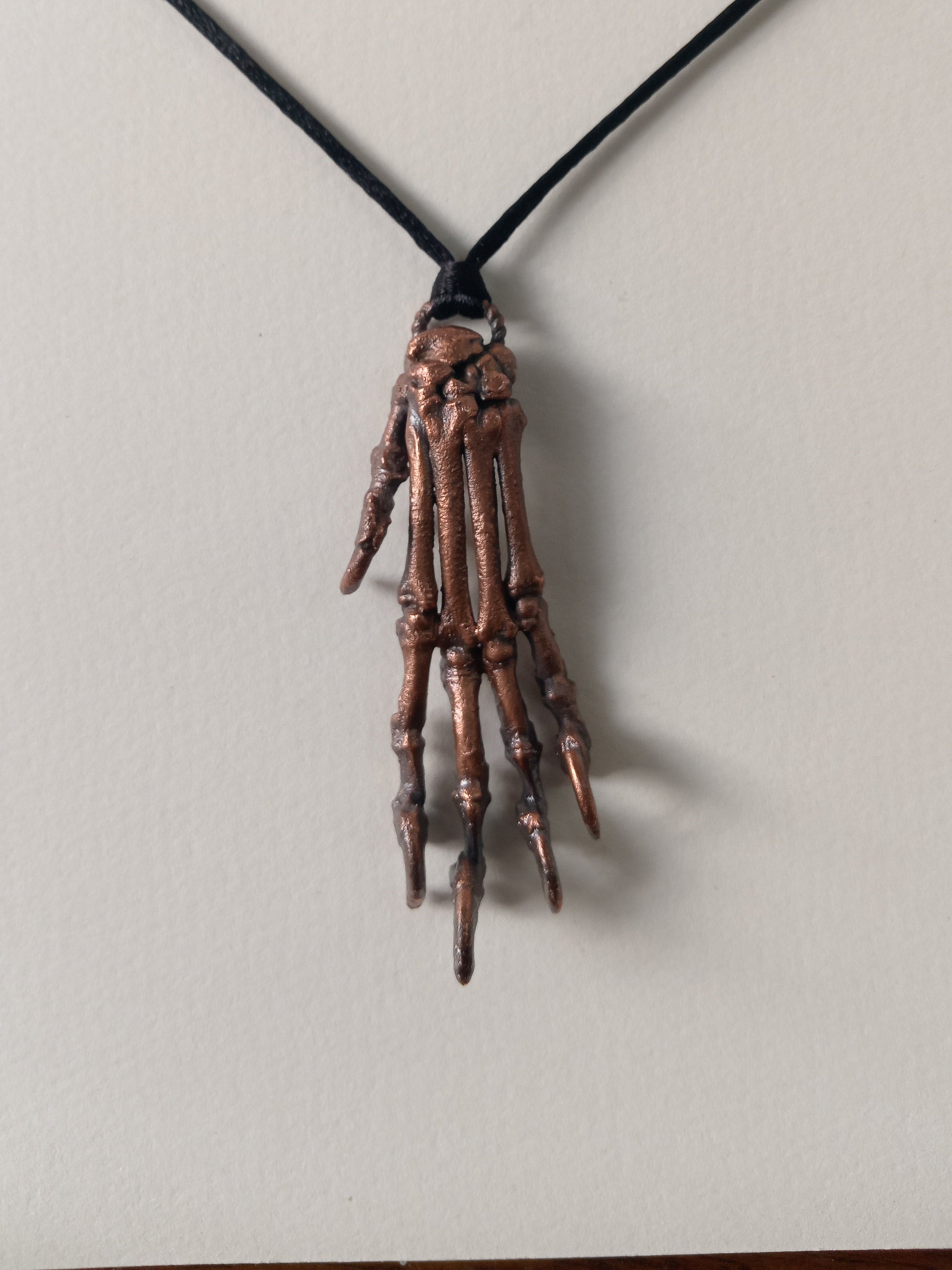 A real cat paw, carefully rearticulated bone by bone, then preserved forever through the art of copper electroforming. Each delicate joint and curve of the paw is captured in metal, transforming a fragile relic into a lasting piece of wearable art.