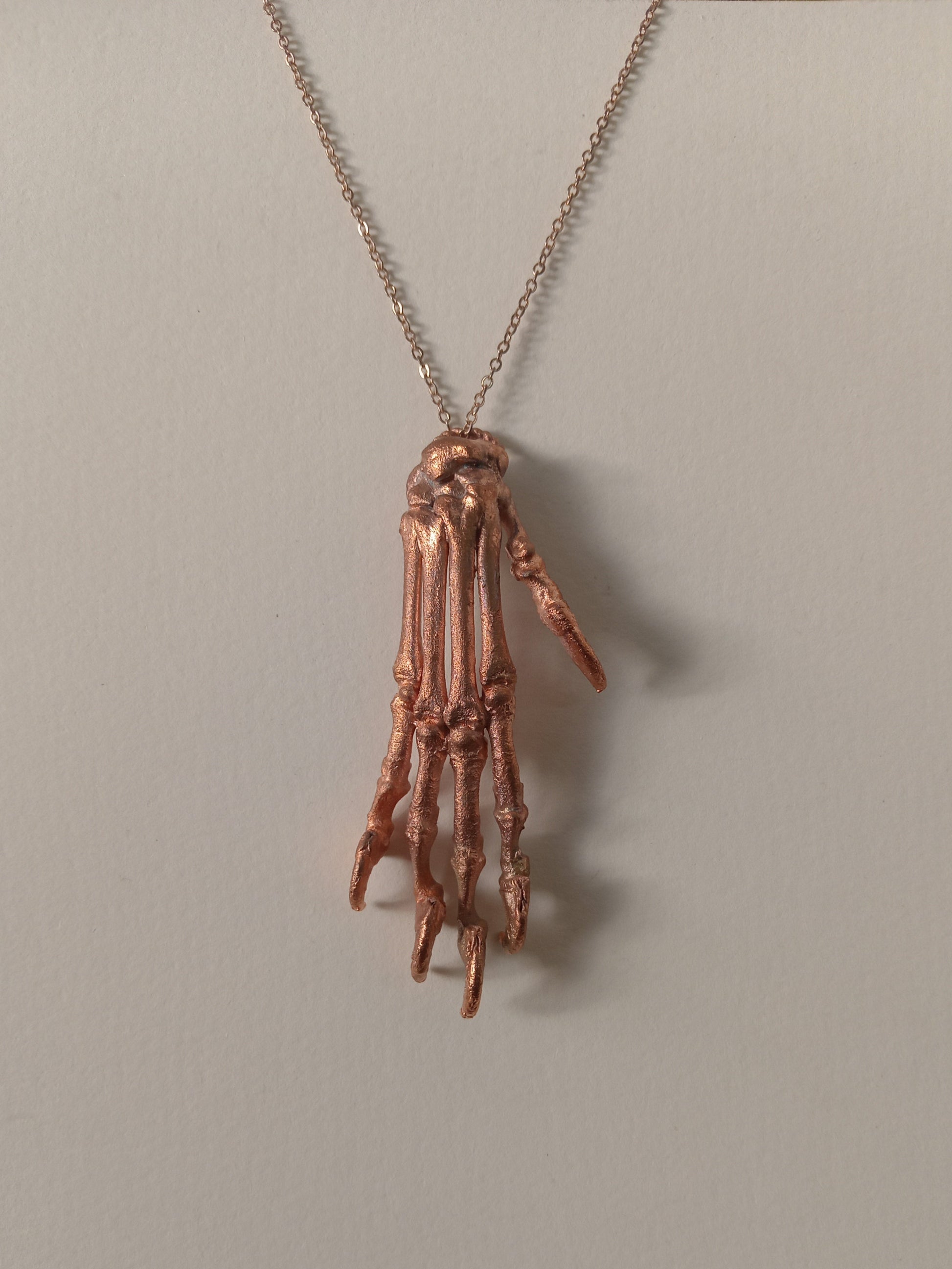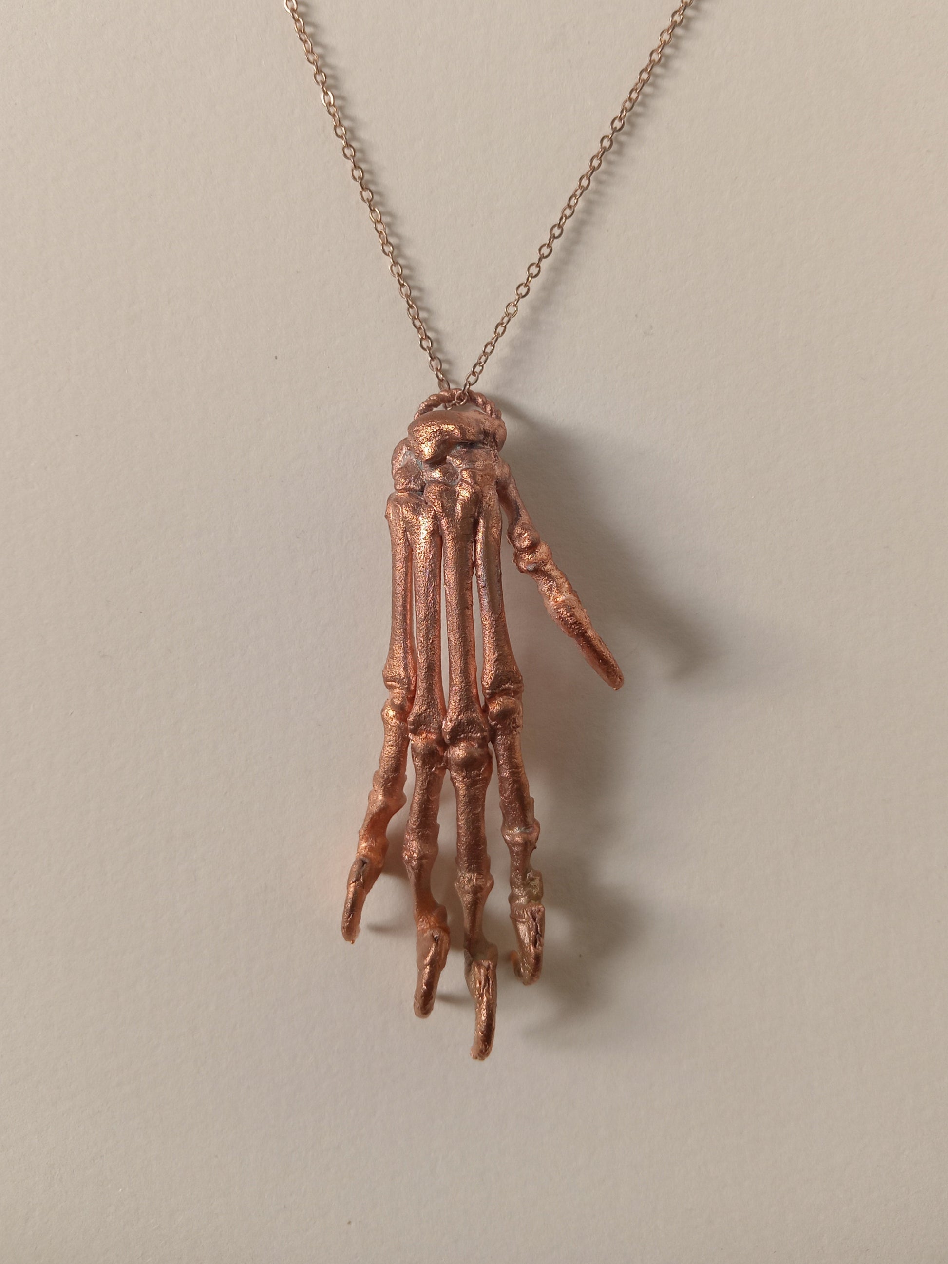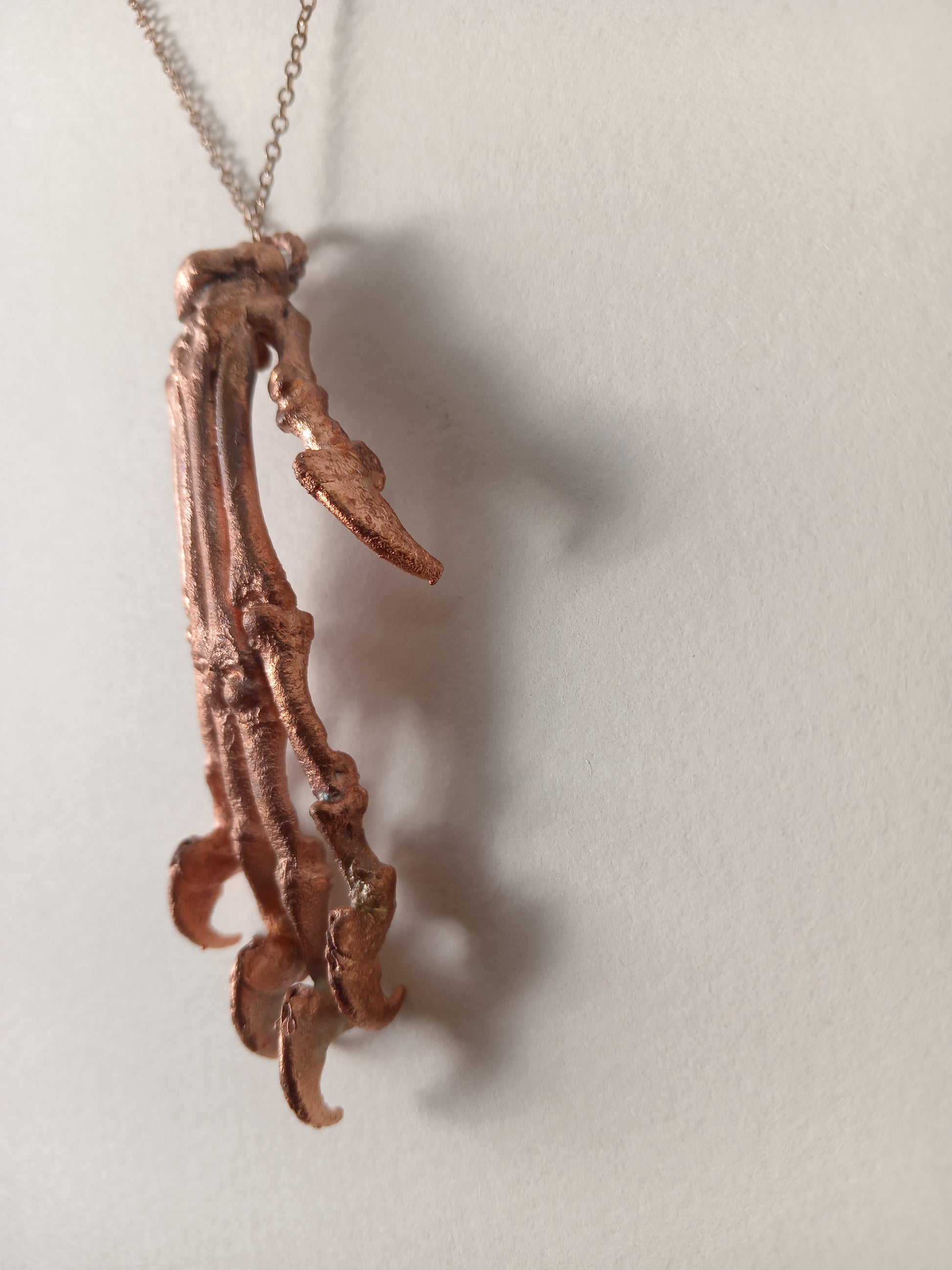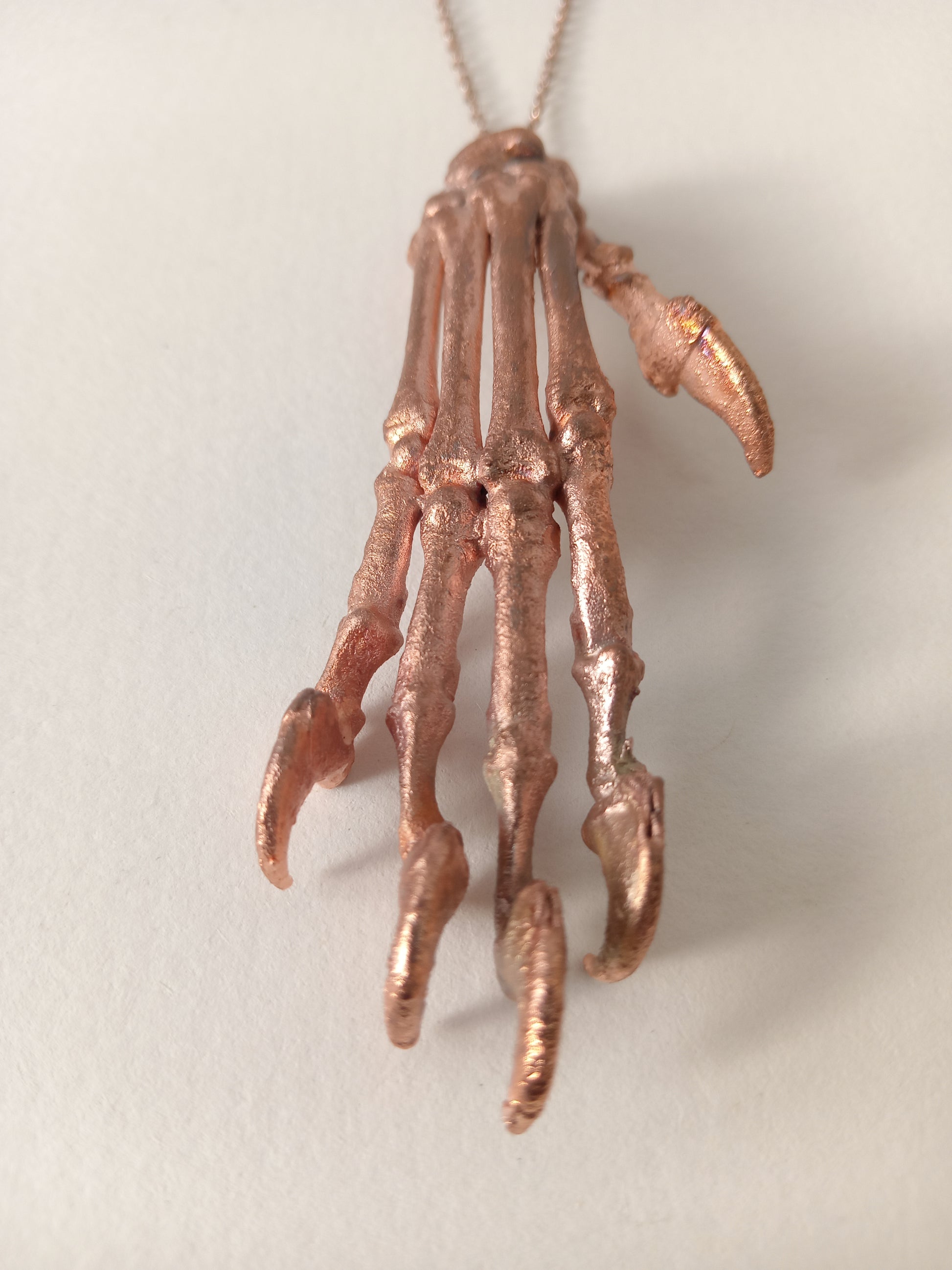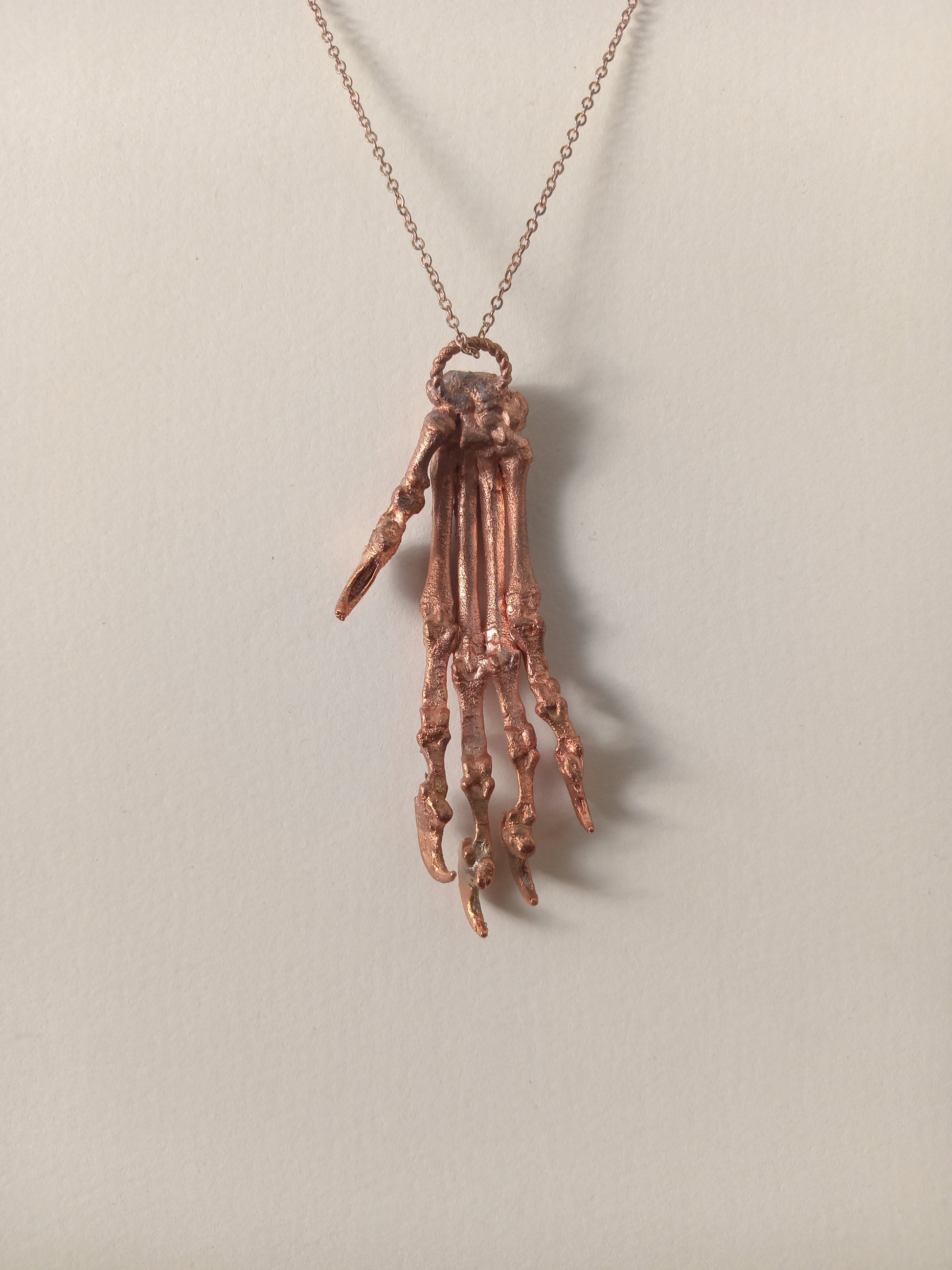 A real cat paw, carefully rearticulated bone by bone, then preserved forever through the art of copper electroforming. Each delicate joint and curve of the paw is captured in metal, transforming a fragile relic into a lasting piece of wearable art.