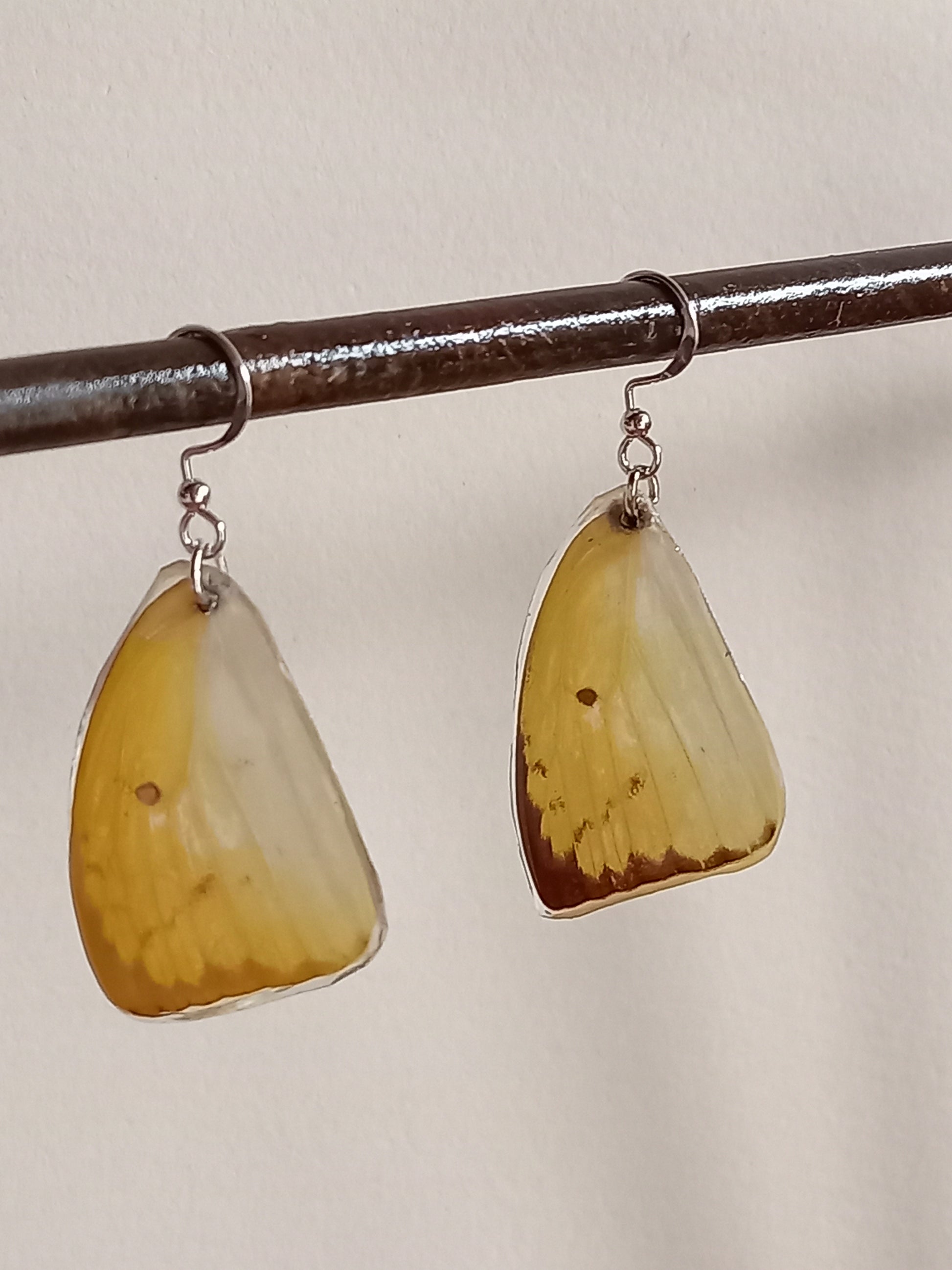 Rare and delicate, these earrings feature real butterfly wings, naturally found and ethically sourced. Each pair is one of a kind. The earrings are paired with sterling silver earring hooks.