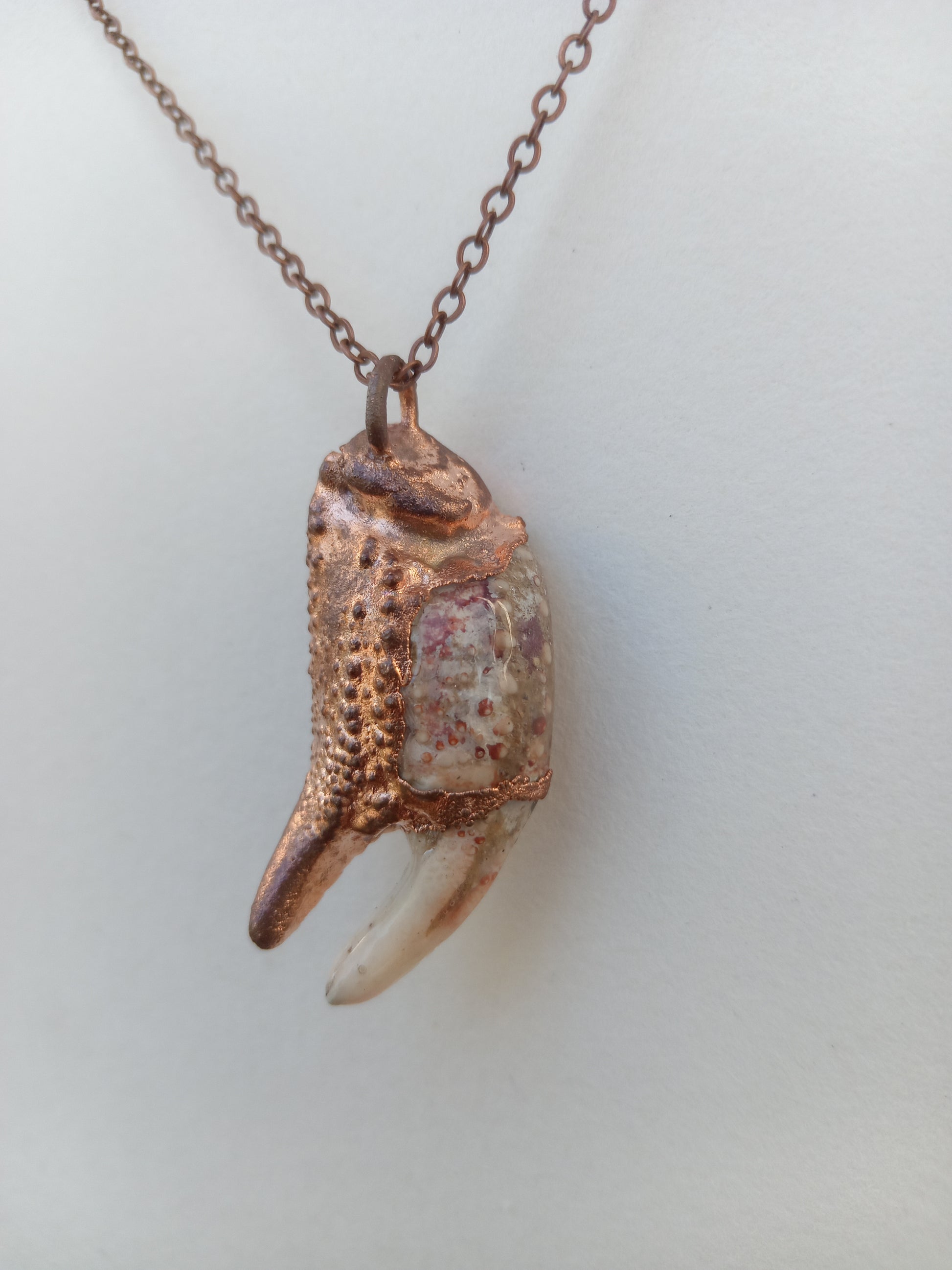 A real crab claw, half sealed in clear resin to reveal its natural colour and fine texture. The other half is electroformed in copper, creating a striking contrast between organic and metal.