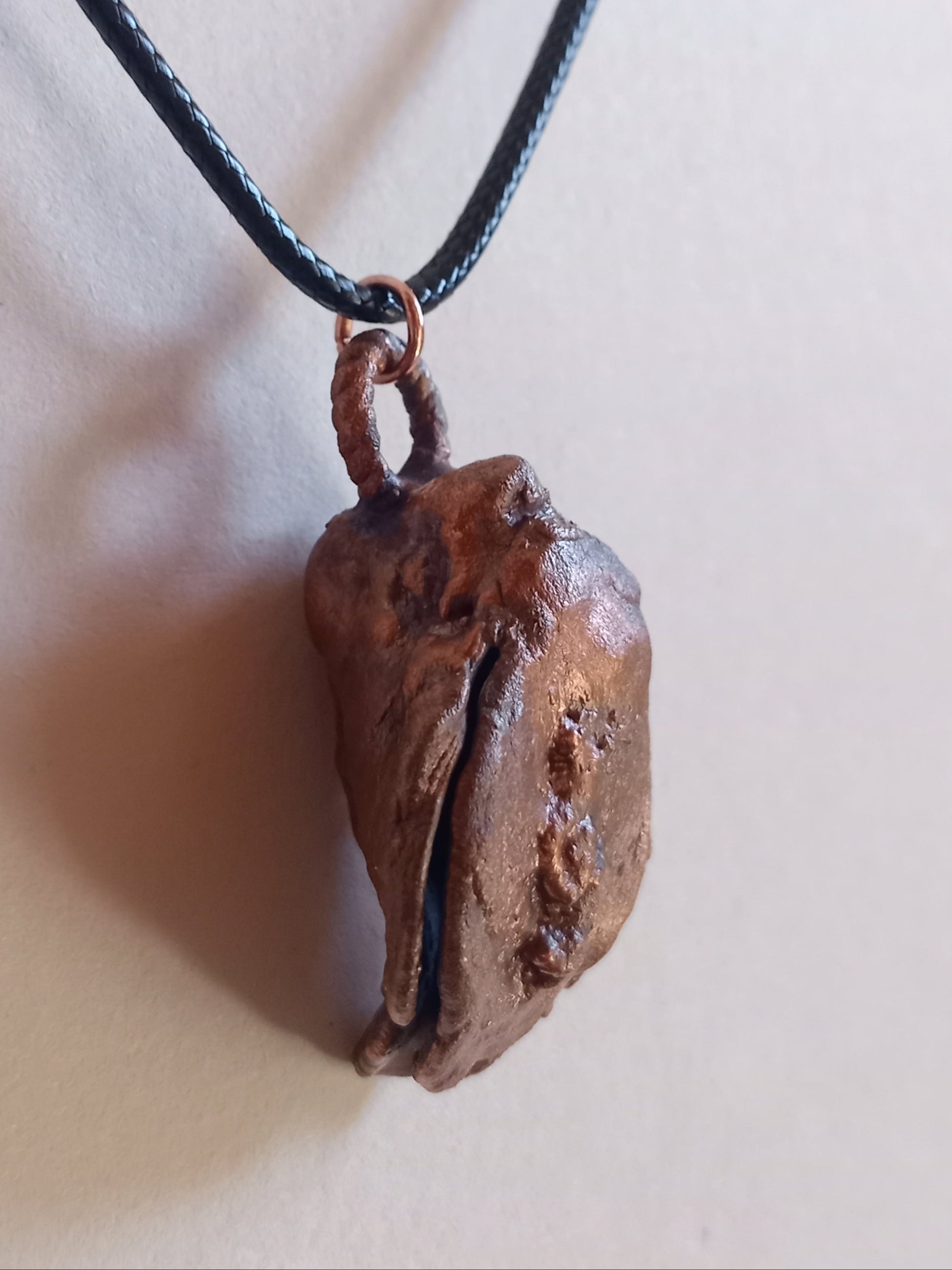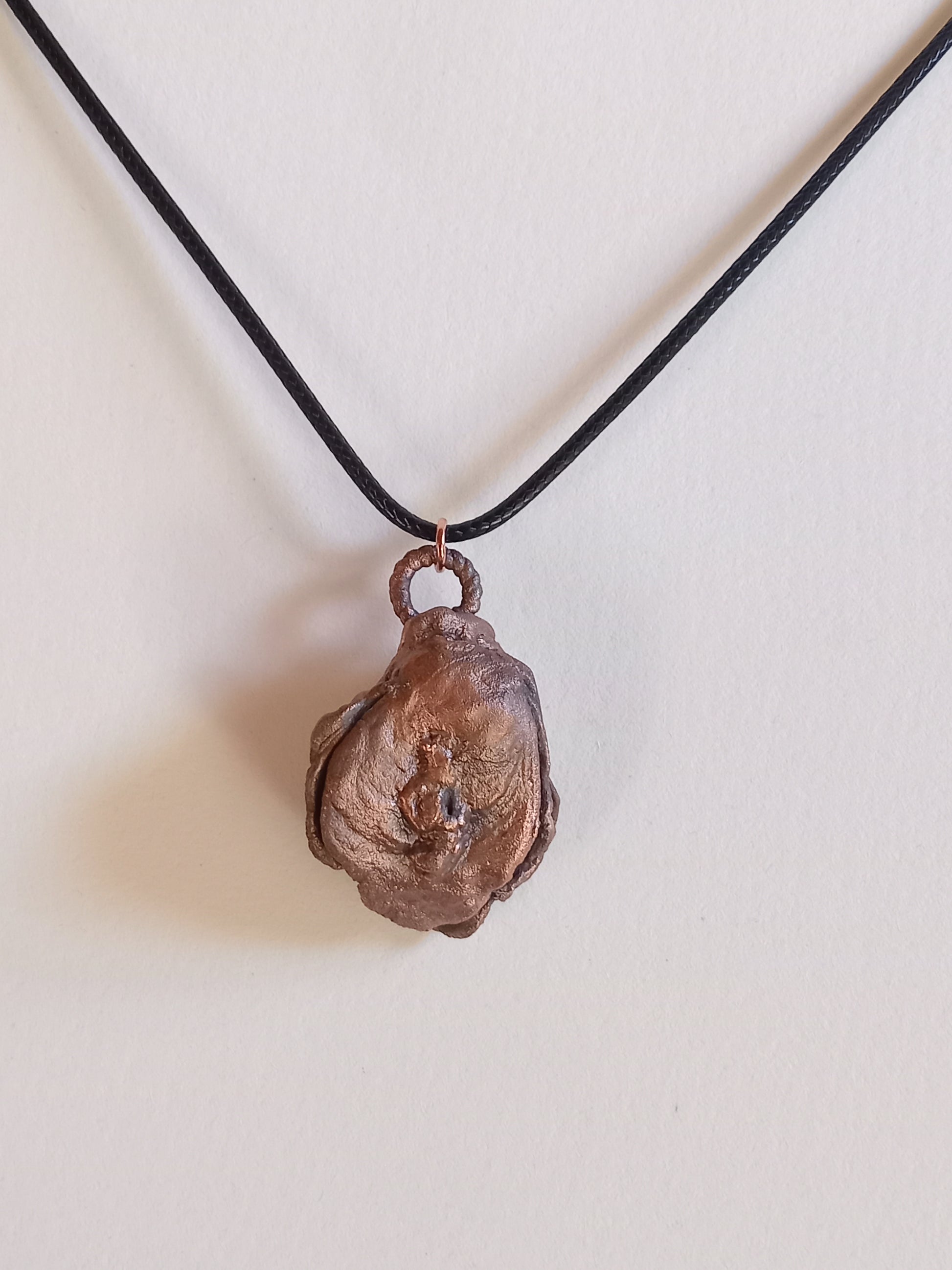 This striking pendant features a real oyster shell, preserved through the ancient process of copper electroforming. The shell’s natural textures and contours are immortalized in metal, highlighting its ocean-born beauty. A piece that carries both strength and serenity — perfect for those drawn to the sea and its quiet power.