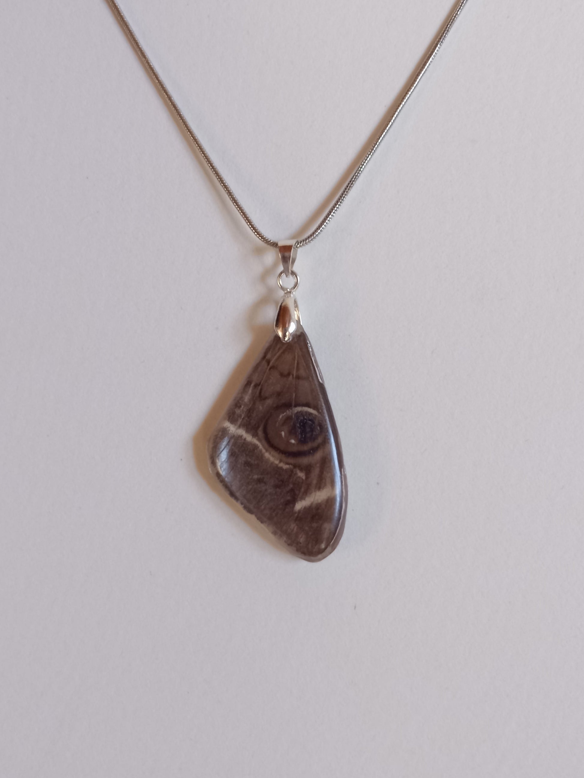 This resin pendant showcases a real Cream-striped owl moth wing in all its glory, suspended on a silver chain. A perfect piece for nature lovers or anyone drawn to the symbolism of transformation and renewal.