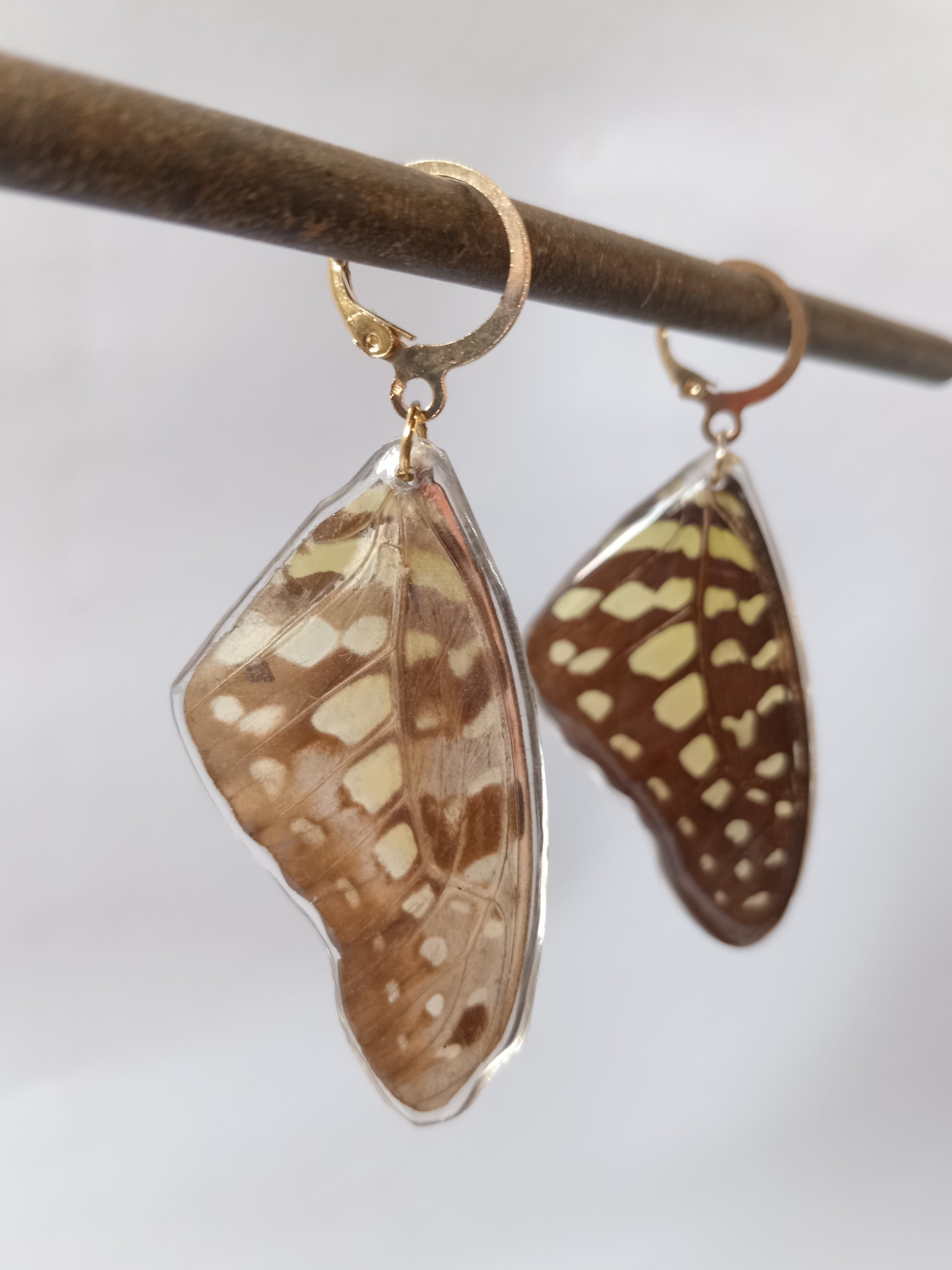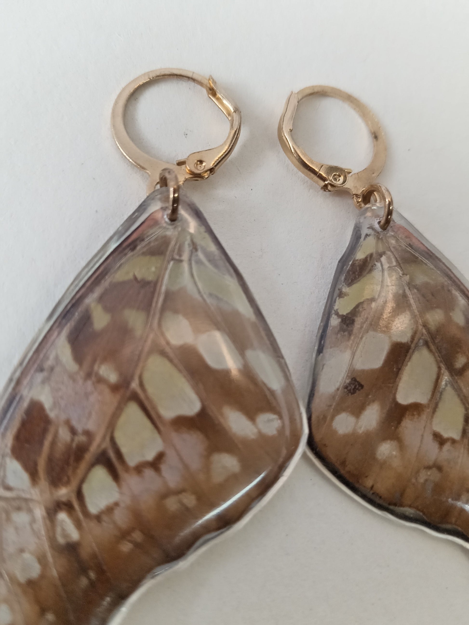 Delicate butterfly wings, ethically sourced and carefully preserved in clear resin, have been transformed into wearable art. The resin preserves and highlights the intricate colors and patterns of the wings, making nature’s intricate details visible up close.