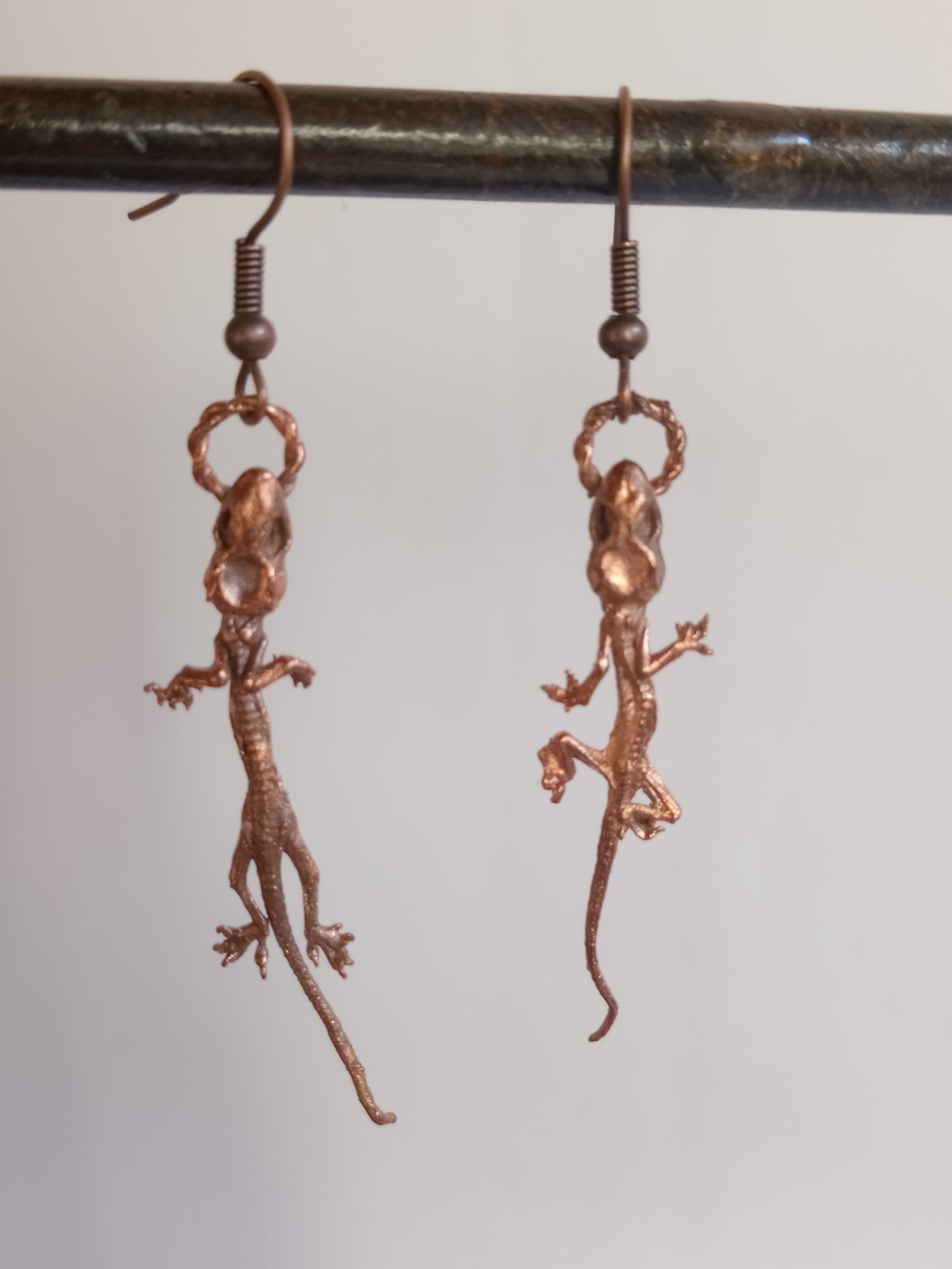 Celebrate the beauty of nature with these one-of-a-kind earrings, crafted from real lizards that were naturally found deceased. Each tiny lizard has been carefully cleaned, preserved, and plated in copper to create a striking and wearable piece of art. Lightweight and detailed, these earrings capture the intricate form of these fascinating creatures, turning them into bold, nature-inspired jewelry.